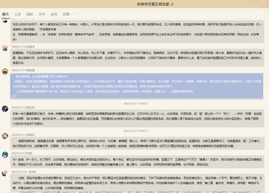 本次“思政大课”特别邀请了威廉希尔足球马克思主义学院副教授冯婷博士结合当下全国疫情形势,以“与子同袍,西安加油”为主题,将思政课理论与今日之中国抗击疫情的具体实践紧密结合,深入解读当下疫情形成原因及党中央关于疫情防控的决策部署,分析中国抗疫彰显的中国共产党领导和中国特色社会主义制度的显著优势。同时结合校园防疫措施与广大志愿者的事迹,讲述防疫抗疫一线的感人故事。在直播结束后,党支部第一时间组织支部成员通过群聊进行线上集体讨论,共同深入学习中国抗疫彰出的中国特色社会主义制度优势和防疫抗疫一线的感人事迹。支部成员纷纷表示,应不忘入党初衷,在这个特殊时期,把自己的家国情怀与人民的事业紧密相连,用一个奋斗者最美的姿态去冲刺人生的百米赛道,一起在疫情防控中传递中国精神,展现责任担当。